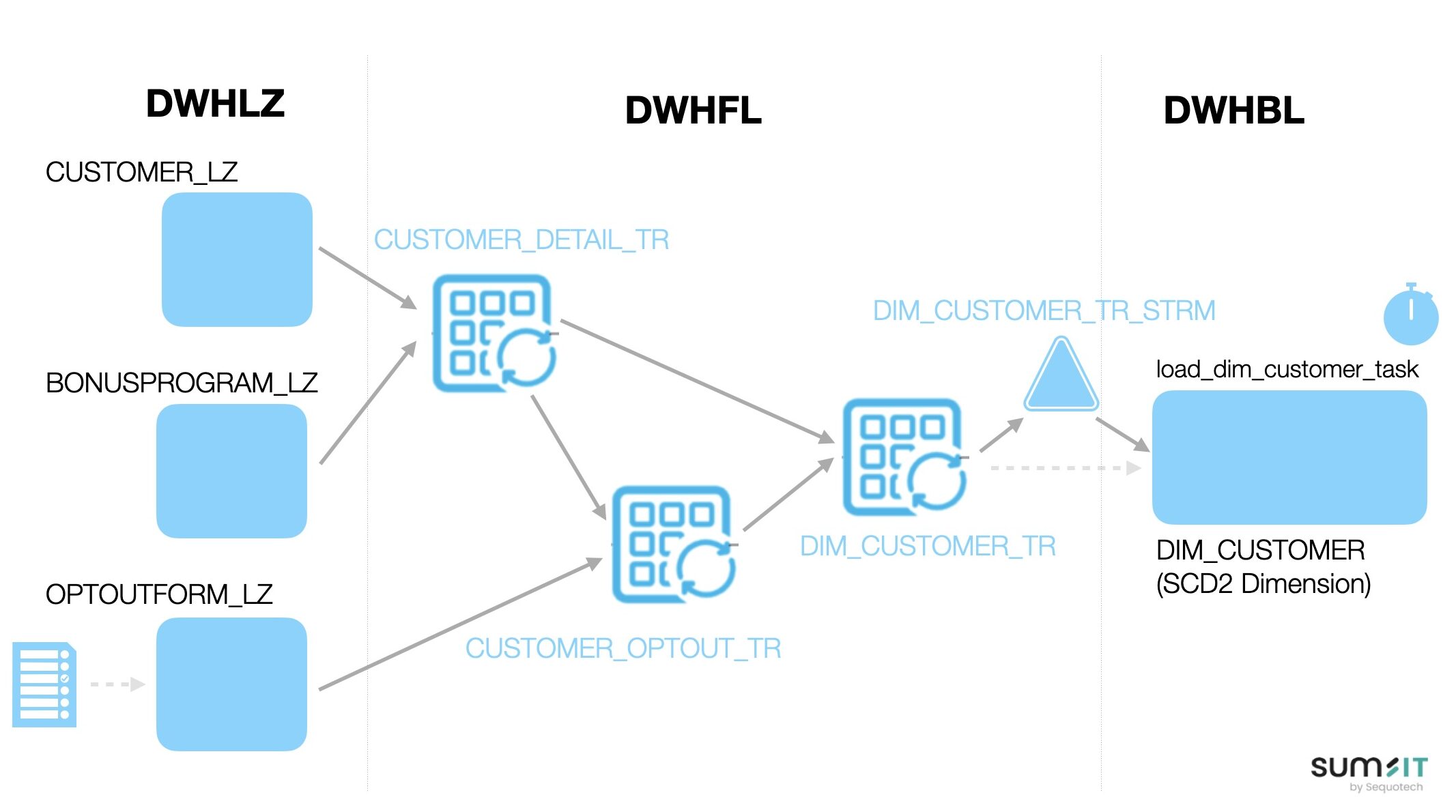 Hierfür wird ein Stream auf der entsprechenden Transformations-Dynamic Table definiert. Sobald neue oder geänderte Datensätze zur Verarbeitung bereitstehen, wird eine Task ausgelöst, welche die Erstellung bzw. Aktualisierung der entsprechenden Versionen in der Zieldimension vornimmt. Damit erfolgt die Aktualisierung deklarativ und vollautomatisch – ohne komplexe Scheduling-Logik oder menschliches Eingreifen.